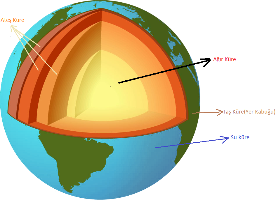 Dünyayı oluşturan katmanların dıştan içe doğru sırası şu şekildedir; hava küre, su küre, taş küre, ateş küre, ağır küre.